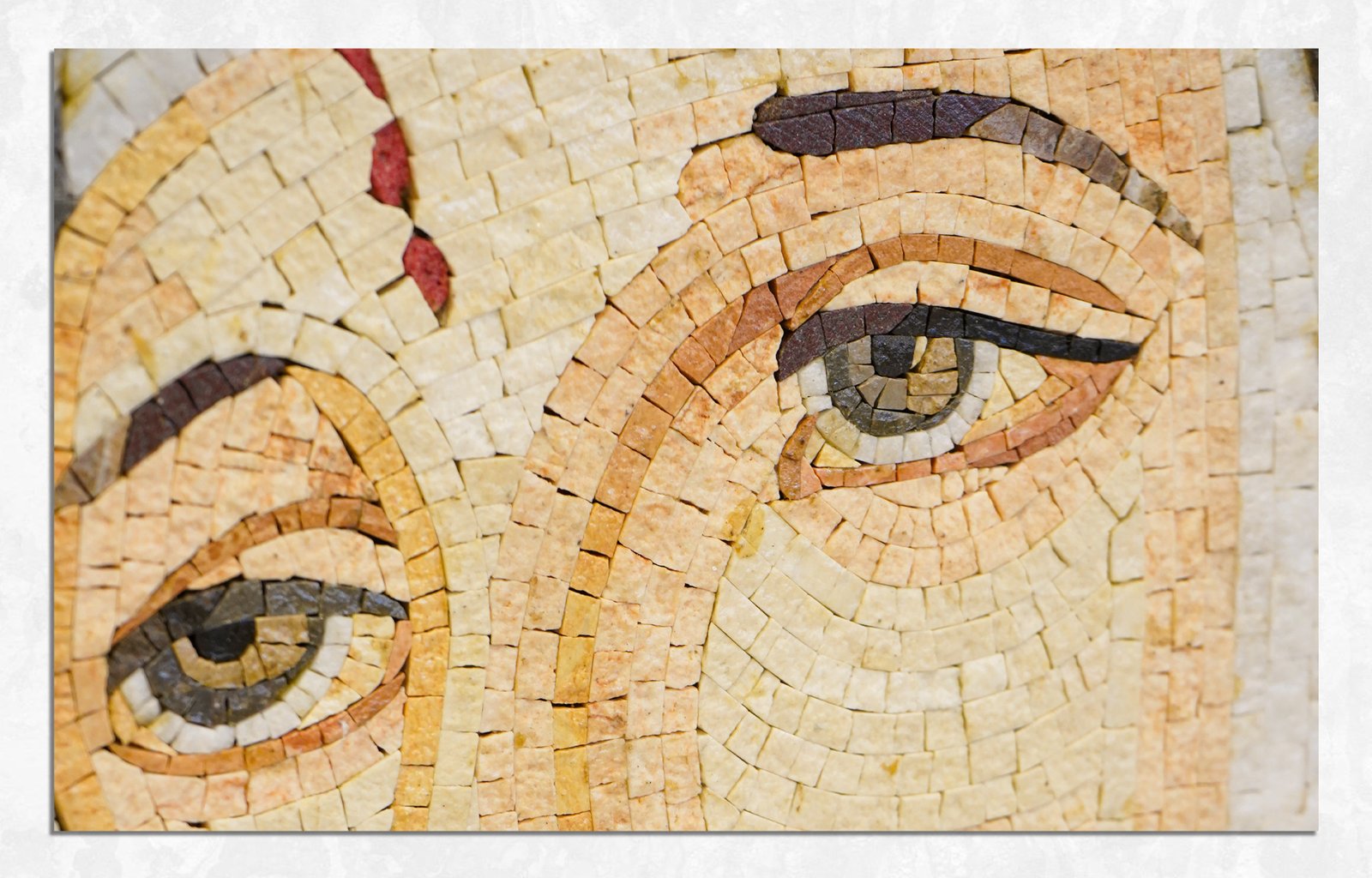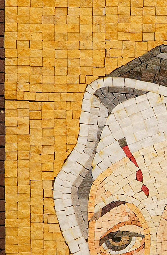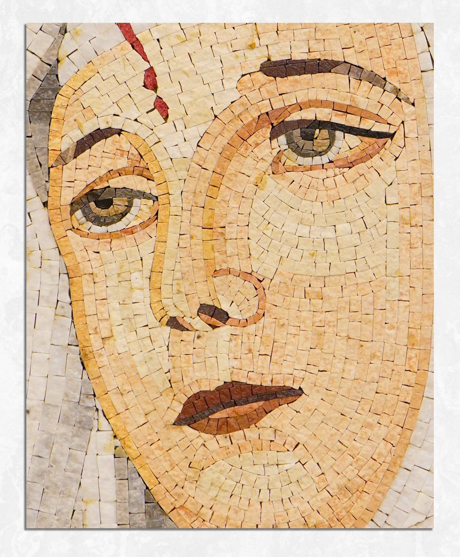 This mosaic is an artistic depiction of a woman's face, embodying the Virgin Mary or a suffering saint, with a small wound on her forehead.