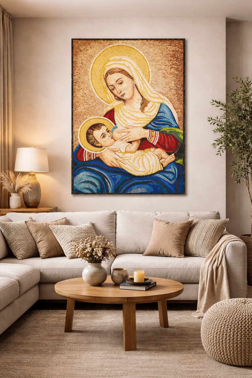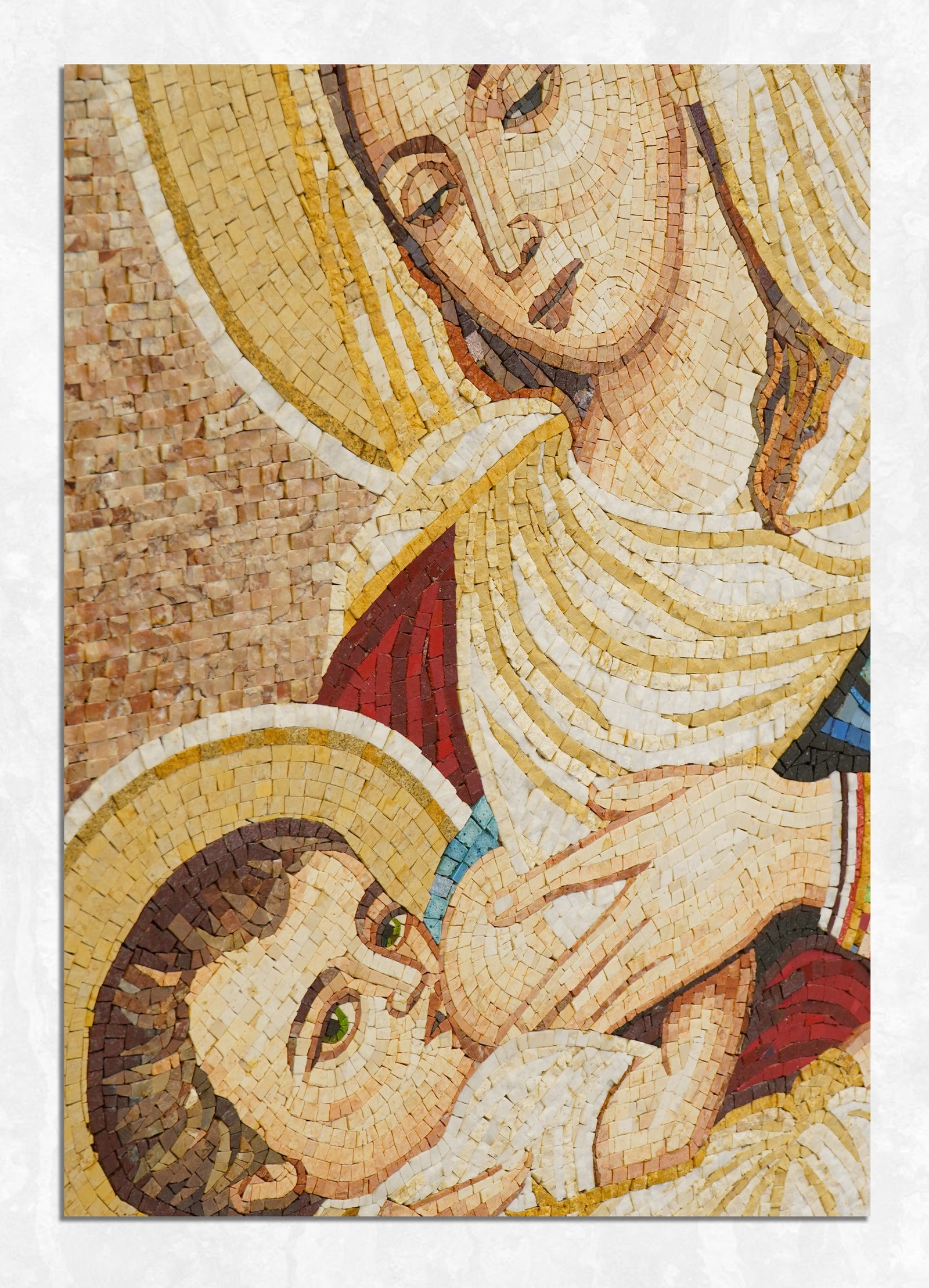 The image shows a religious mosaic depicting the Virgin Mary nursing the infant Lord Jesus.