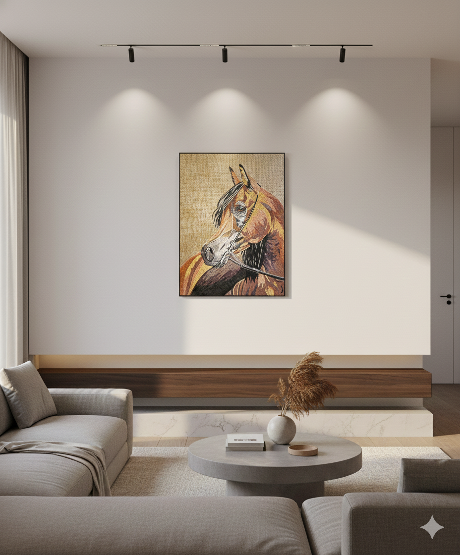 Elevate your space with the timeless elegance of the the Terra Horse. This is not just a mosaic; it is a labor of love, meticulously assembled piece by piece using only 100% natural stones.