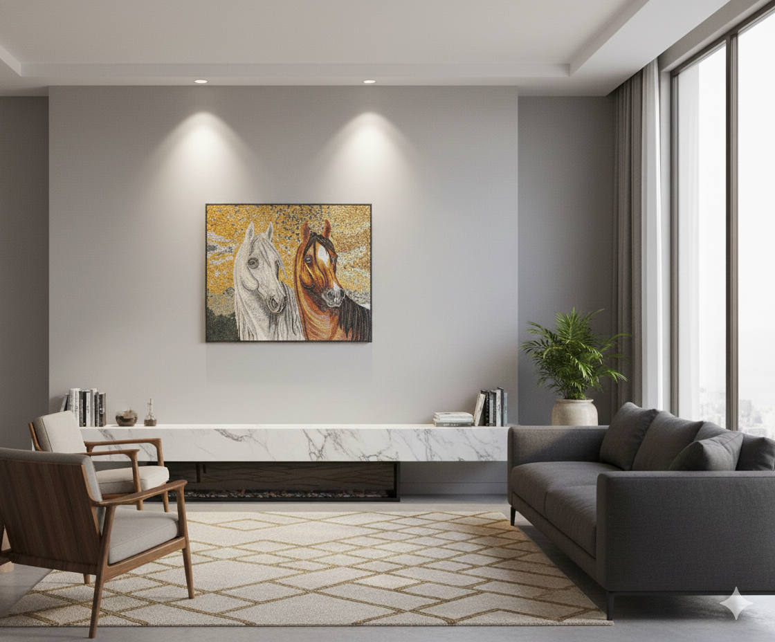 Unlike printed art, this piece offers a unique tactile texture and a play of light that changes throughout the day as it hits the natural mineral surfaces. It is a testament to patience and precision, perfect for any lover of horses or fine craftsmanship.