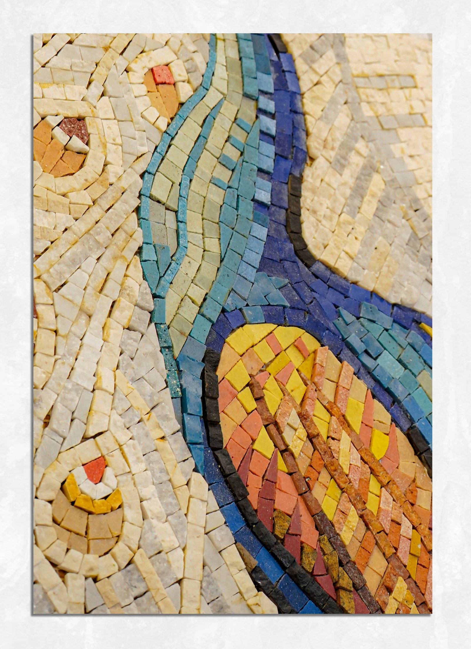 The varied colors and textures of the stone pieces highlight a unique depth and beauty in the mosaic.