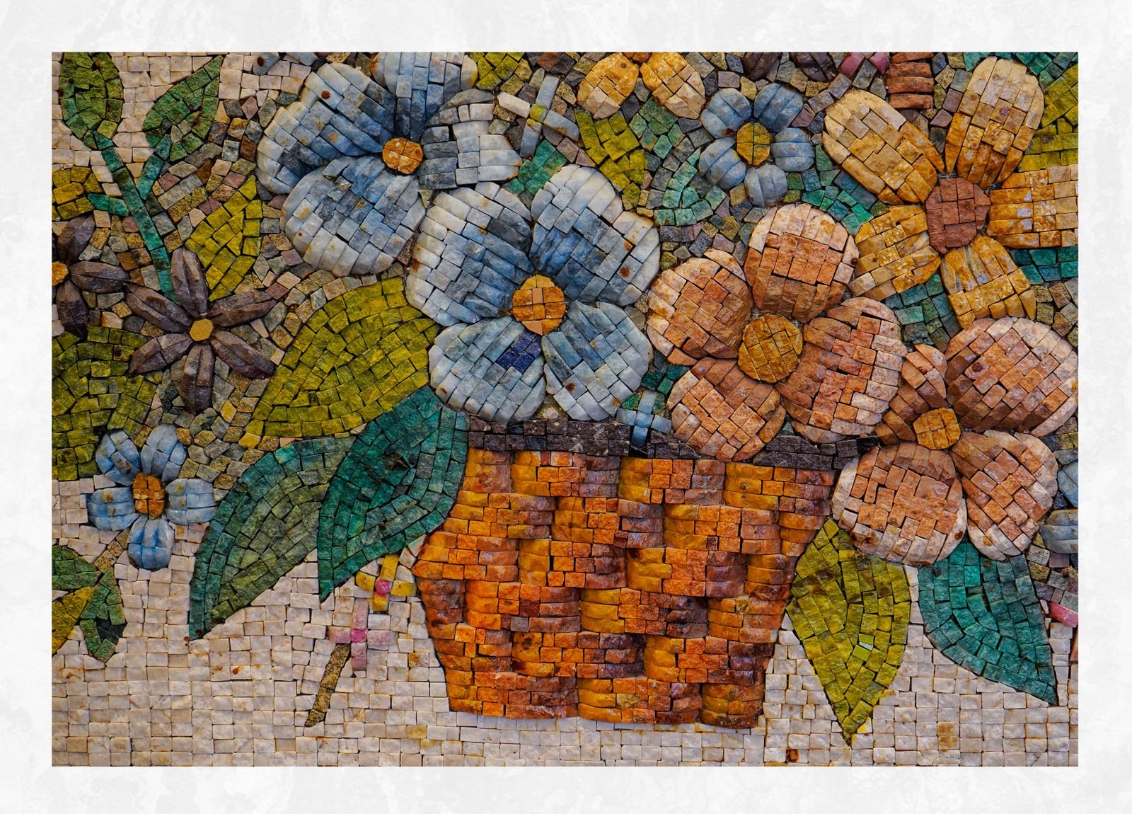 Bring timeless beauty into your space with this exquisite handmade mosaic artwork, carefully crafted from 100% natural stones. This stunning piece features a graceful basket overflowing with vibrant flowers and lush leaves, arranged with exceptional detail to create depth, warmth, and elegance.