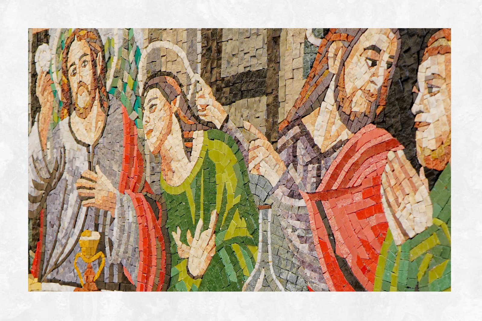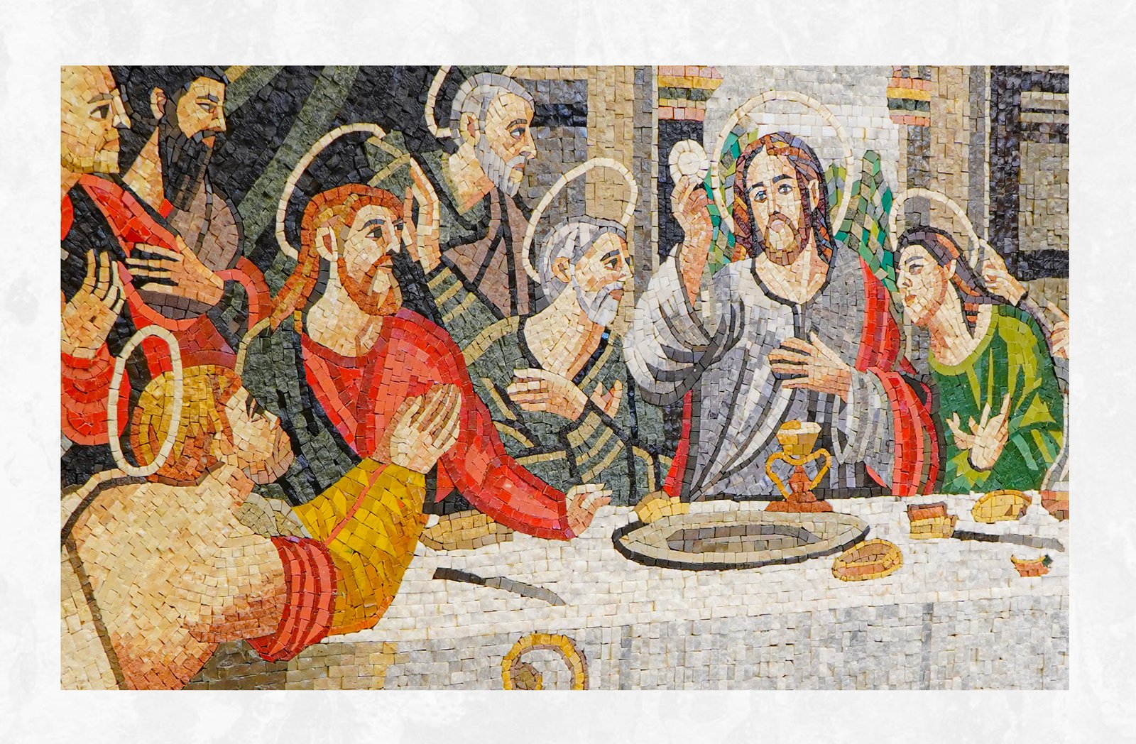 This mosaic artwork captures the moment when Jesus announces that one of his disciples will betray him.