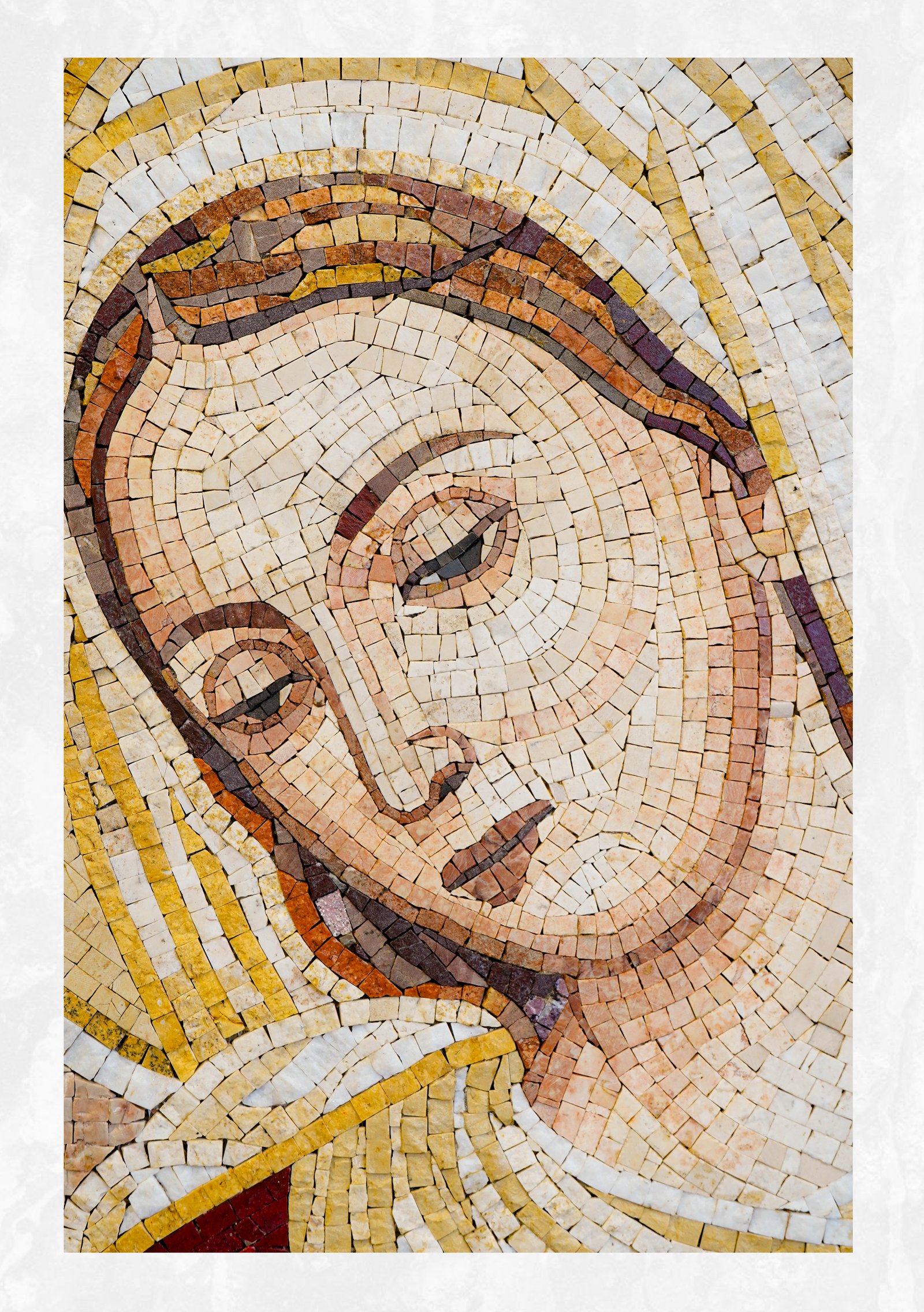 The image shows a religious mosaic depicting the Virgin Mary nursing the infant Lord Jesus.