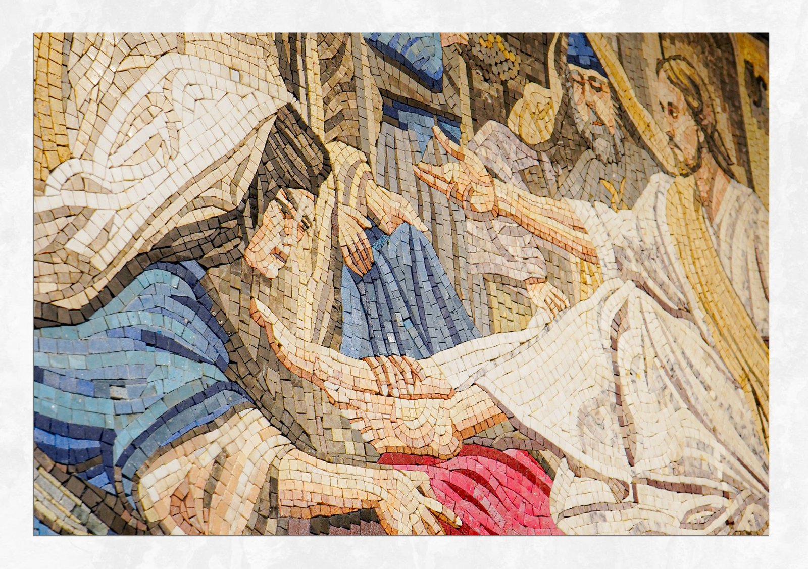 This mosaic depicts the biblical story of Jesus and the sinful woman, likely in the house of Simon the Pharisee.