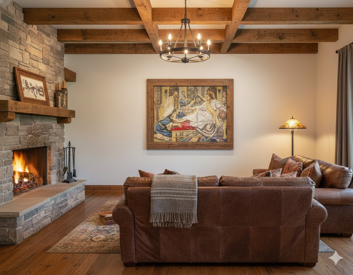 The mosaic style uses small, colored pieces of material (tesserae) to create the image.