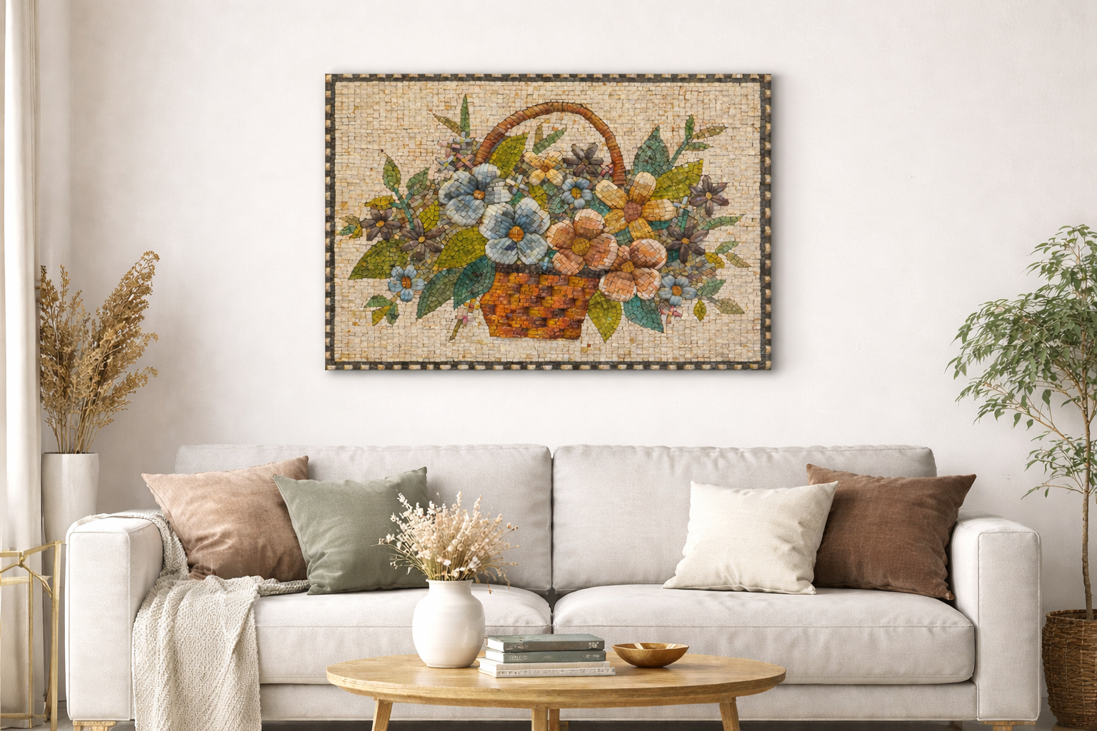 Bring timeless beauty into your space with this exquisite handmade mosaic artwork, carefully crafted from 100% natural stones. This stunning piece features a graceful basket overflowing with vibrant flowers and lush leaves, arranged with exceptional detail to create depth, warmth, and elegance.