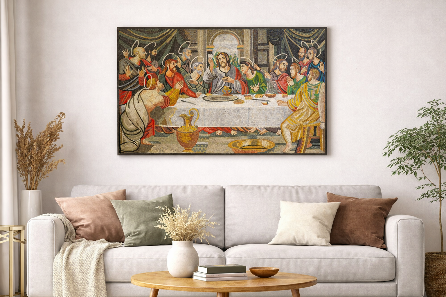 This mosaic artwork captures the moment when Jesus announces that one of his disciples will betray him.